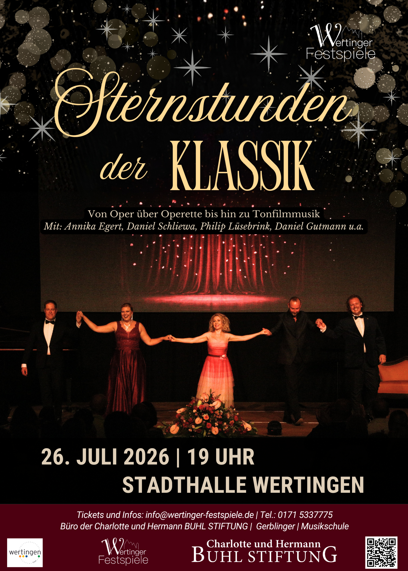 Sternstunden der Klassik (Wertinger Festspiele) Arien und Duette aus Oper und Operette Musikalische Leitung: Stellario Fagone + Zu Google Kalender hinzufügen + iCal / Outlook exportieren 00 Tage 00 Stunden 00 Minuten 00 Sekunden Datum 26 Juli 2026 Uhrzeit 7:00 pm - 9:00 pm Standort Wertingen Stadthalle Veranstalter Wertinger Festspiele Teile diese Veranstaltung